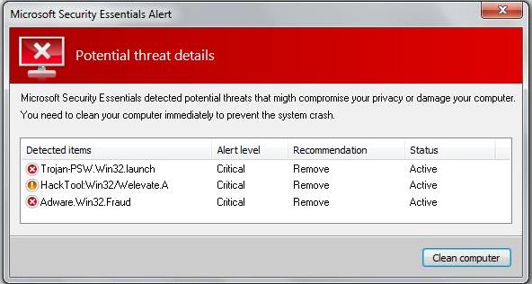 This fake report impersonates Microsoft Security Essentials by displaying "Microsoft Security Alert - Potential threat details". Please see the following image.